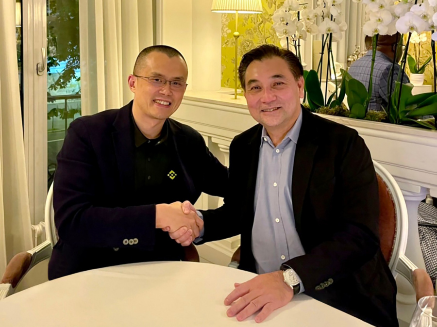 ฉางเผิง จ้าว หรือ CZ (ซ้ายมือ) ประธานเจ้าหน้าที่บริหารไบแนนซ์ (Binance) ลงนามสัญญาผู้ถือหุ้นกับนายสารัชถ์ รัตนาวะดี (ขวามือ) ประธานเจ้าหน้าที่บริหาร บริษัท กัลฟ์ เอ็นเนอร์จี ดีเวลลอปเมนท์ จำกัด (มหาชน) เมื่อวันที่ 13 เมษายน ที่กรุงปารีส ประเทศฝรั่งเศส เพื่อจัดตั้งบริษัทร่วมทุนในการดำเนินธุรกิจศูนย์ซื้อขายสินทรัพย์ดิจิทัลในประเทศไทย รวมถึงการลงทุนในสกุลเงินดิจิทัล BNB และธุรกิจศูนย์ซื้อขายสินทรัพย์ดิจิทัลในประเทศสหรัฐอเมริกา (Binance US)