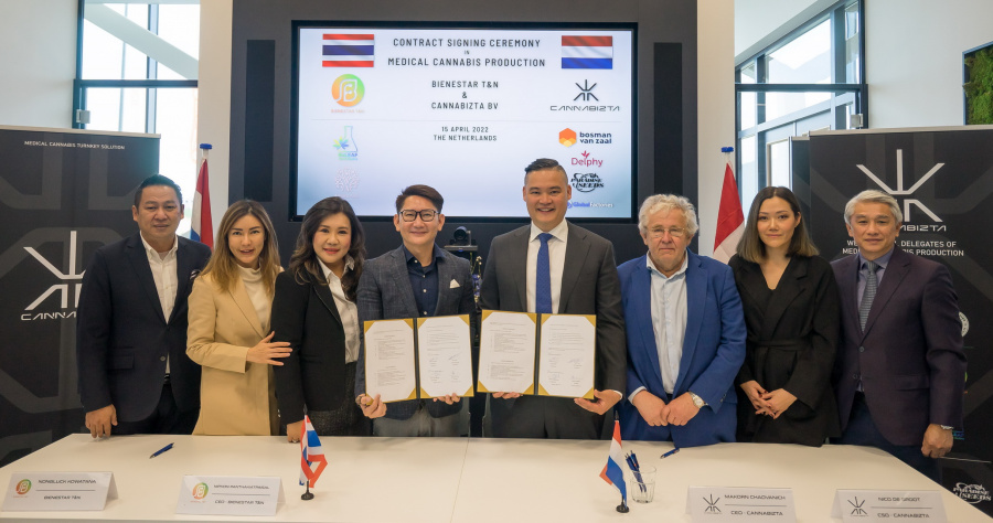 Bienestar T&N Co., Ltd., Thailand’s leading cannabis cultivator and manufacturer of medical cannabis, announced collaborative partnership with Cannabizta B.V. (Medical Cannabis Turnkey Solution), together with the Netherlands’ leading business partners including Bosman Van Zaal B.V. (International Expert in the Development, Production, and Installation of Turnkey Automated Horticulture Projects), Delphy B.V. (Worldwide Expertise For Food and Flowers), and Paradise Seeds B.V. (Worldwide Medical Cannabis Genetics) for the increase of manufacturing production capacity and the integrated development of cannabis strains for Thailand to become an epicentre for medical cannabis industry in Asia. Held in Amsterdam, the Netherlands, the contract signing ceremony was witnessed by Mr.Chatri Atchananan, Ambassador Extraordinary and Plenipotentiary of Thailand to the Kingdom of the Netherlands and Dr.Somsak Akksilp, Director-General of Department of Medical Services, along with a team of top executives.