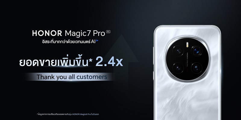 24 กุมภาพันธ์ 2568, กรุงเทพฯ – ออเนอร์ (HONOR) ผู้ให้บริการอุปกรณ์อัจฉริยะชั้นนำระดับโลก ประกาศความสำเร็จครั้งสำคัญของสมาร์ตโฟนระดับแฟลกชิป HONOR Magic7 Pro 5G ซึ่งได้รับกระแสตอบรับอย่างล้นหลามจากผู้บริโภค กวาดยอดขายและเติบโตสูงสุดถึง 2.4 เท่า นับตั้งแต่เปิดให้พรีออเดอร์ระหว่างวันที่ 11 – 21 กุมภาพันธ์ 2568 ทั้งช่องทางออฟไลน์และแพลตฟอร์มอีคอมเมิร์ซชั้นนำ โดยความสำเร็จครั้งนี้สะท้อนถึงความเชื่อมั่นของผู้บริโภคที่มีต่อคุณภาพผลิตภัณฑ์ นวัตกรรมและเทคโนโลยีล้ำสมัยของ HONOR โดยเฉพาะการพัฒนา AI อัจฉริยะ กล้องประสิทธิภาพสูง และระบบประมวลผลทรงพลัง ที่ออกแบบมาเพื่อตอบโจทย์ทุกไลฟ์สไตล์อย่างสมบูรณ์แบบ